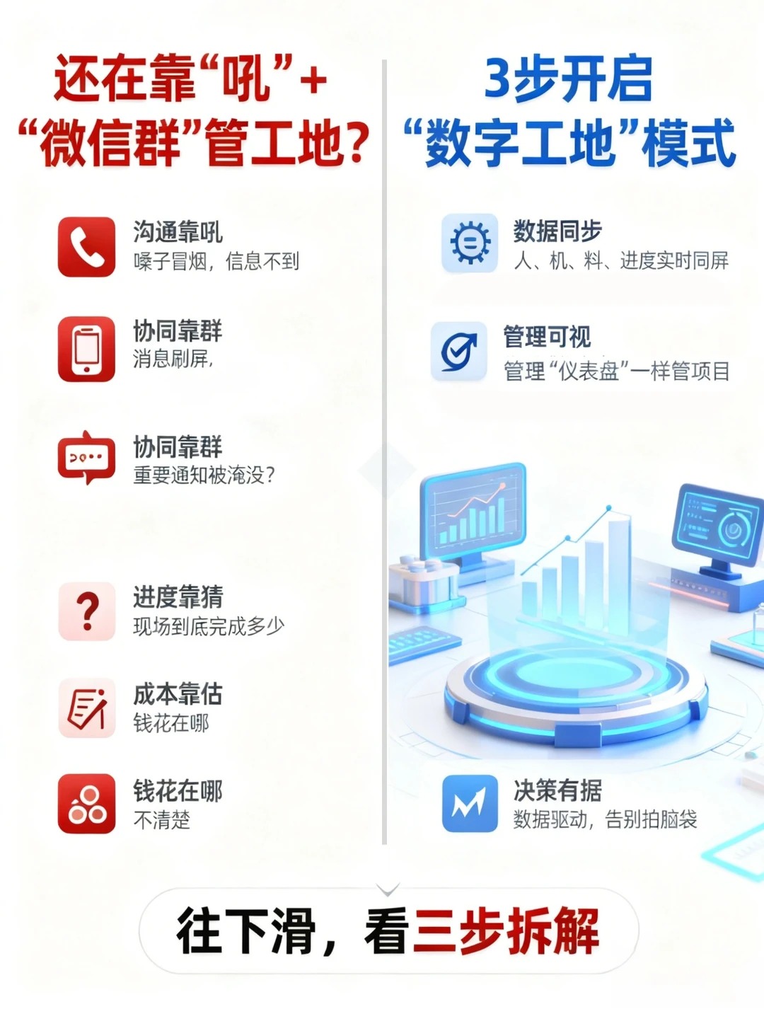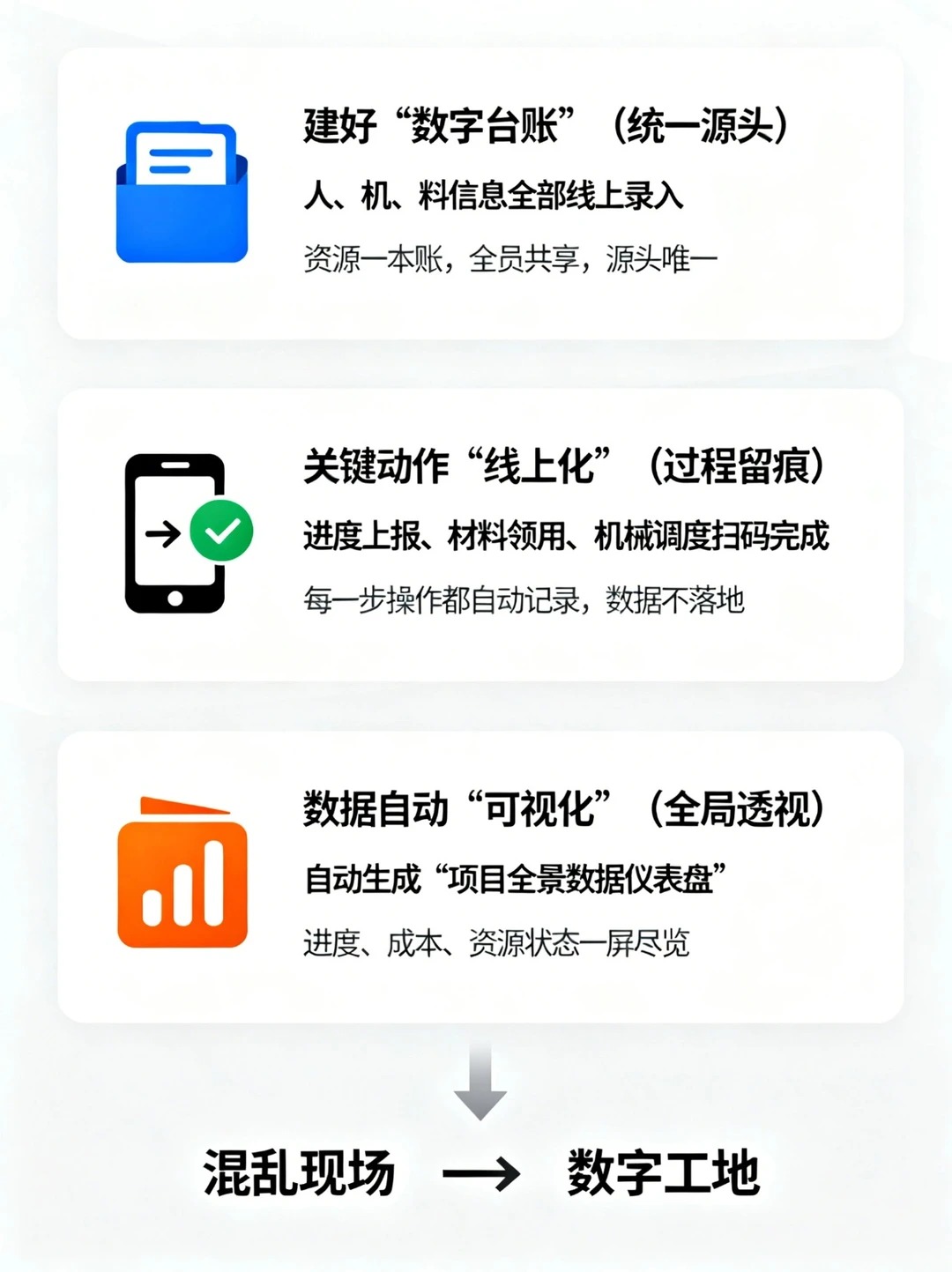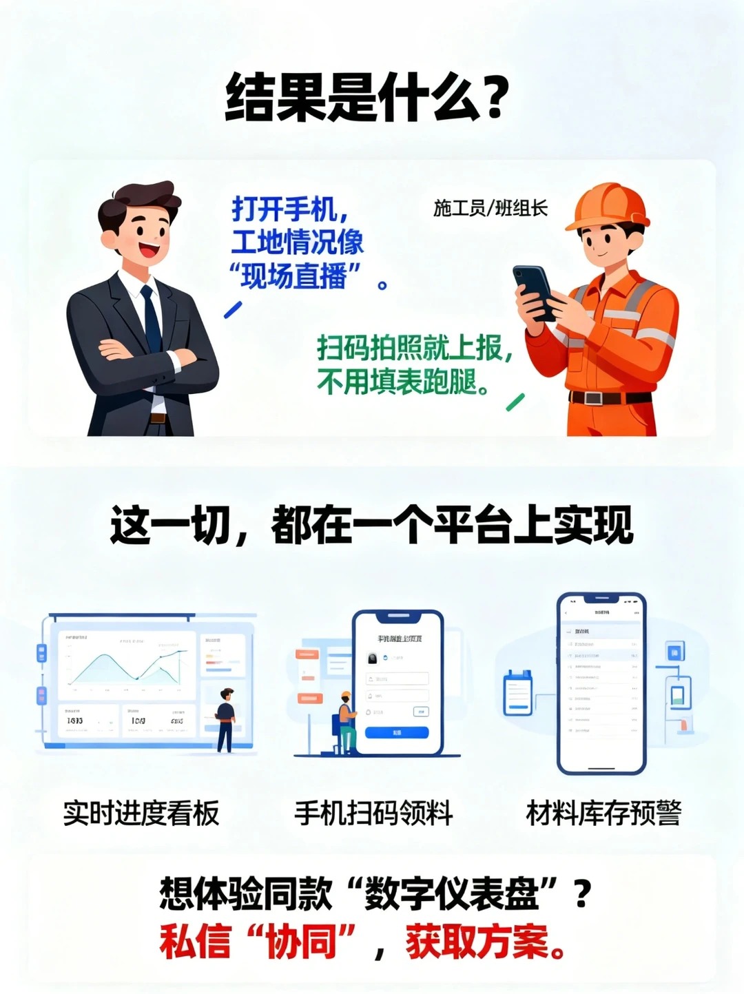 工地现场是不是总这样❓ ▶️ 人到了,材料没到… ▶️ 机械闲置,班组干等… ▶️ 进度报上去,成本对不上… ▶️ 群里@所有人,已读不回,一问三不知… - 别吼了!工程协同真的不用那么累。 今天教你 3 步搞定 人、机、料、进度、成本数据 实时同步,让项目像开车看仪表盘一样清晰! - 🚀 协同三步法,一张图看懂 第1步:统一线上台账 ✅ 所有资源(人员班组、机械设备、材料清单)录入系统,形成唯一真实源。 ✅ 谁有哪些技能、设备在哪、材料库存多少,全员共享,一目了然。 - 第2步:关键动作线上化 ✅ 进度上报:手机拍照+填写百分比,自动关联计划。 ✅ 材料领用:扫码出库,自动扣减库存,数据实时同步至项目成本。 ✅ 机械调度:申请、派工、签认、结算全流程线上留痕。 - 第3步:数据自动聚合,可视化呈现 ✅ 所有动作数据自动归集,生成 项目全景仪表盘。 ✅ 进度完成百分比、材料消耗量、机械台班、实时成本…统统在一个屏上显示。 - 💡 结果是什么? 老板/项目经理:不用再打电话催进度,打开手机或电脑,现场情况如同 “直播”。 施工员/班组长:不用填一堆表格,扫码、拍照,一步搞定。 材料员/机务员:库存、状态实时可视,提前预警,保障供应。 协同的本质,是 让数据跑起来,让人少跑腿。 把沟通成本降低,把执行效率提高。