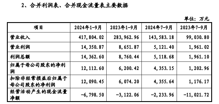 2024年7-9月,公司营业收入为14.36亿元,较上年同期增长44.99%,归属于母公司股东的净利润为4353.15万元,较去年同期增加261.87%。
