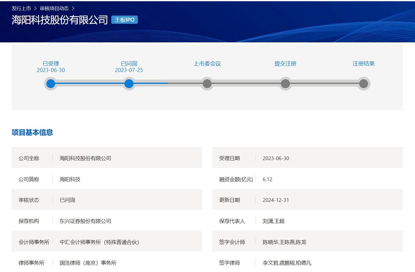 上交所网站显示,海阳科技的IPO于2023年6月30日获受理,保荐机构为东兴证券股份有限公司,保荐代表人为刘潇、王超,会计师事务所为中汇会计师事务所(特殊普通合伙)。