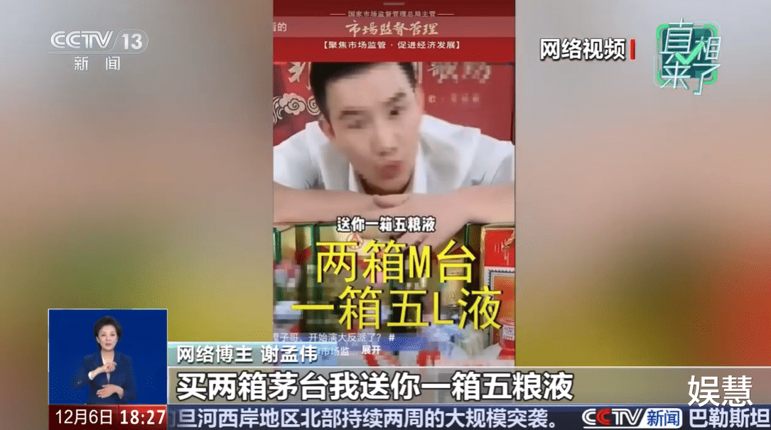 报道中放出了谢孟伟在直播间激情澎湃卖酒的画面,经市场监管部门调查确认,谢孟伟直播间售卖的所谓茅台和五粮液均为贴牌勾兑的假货。