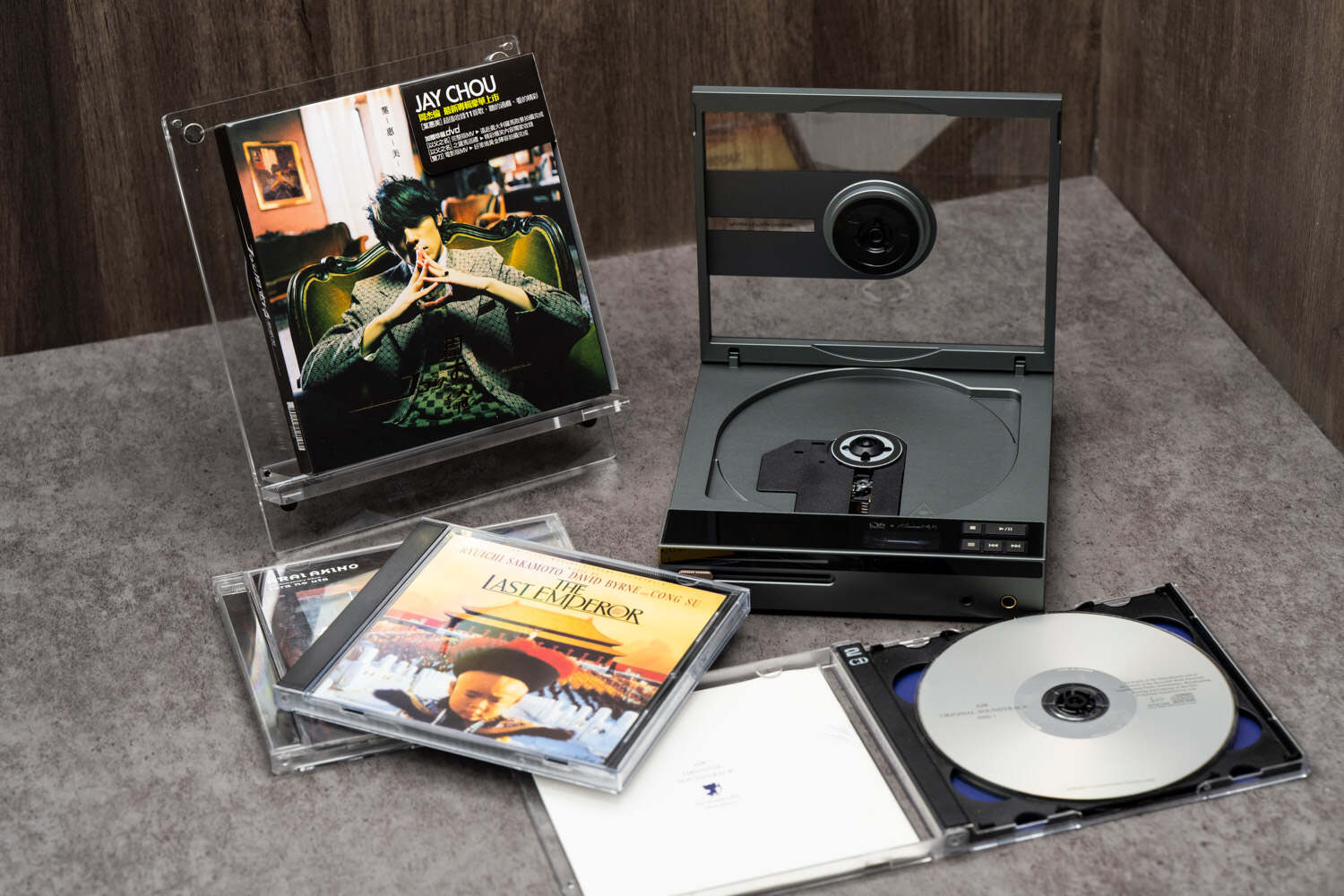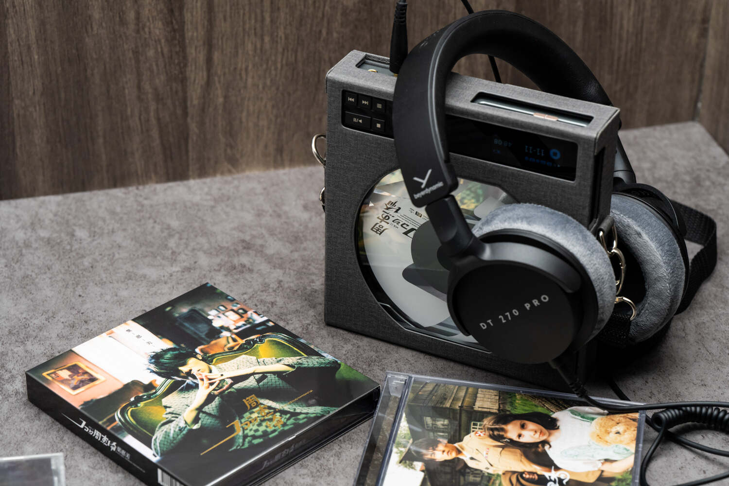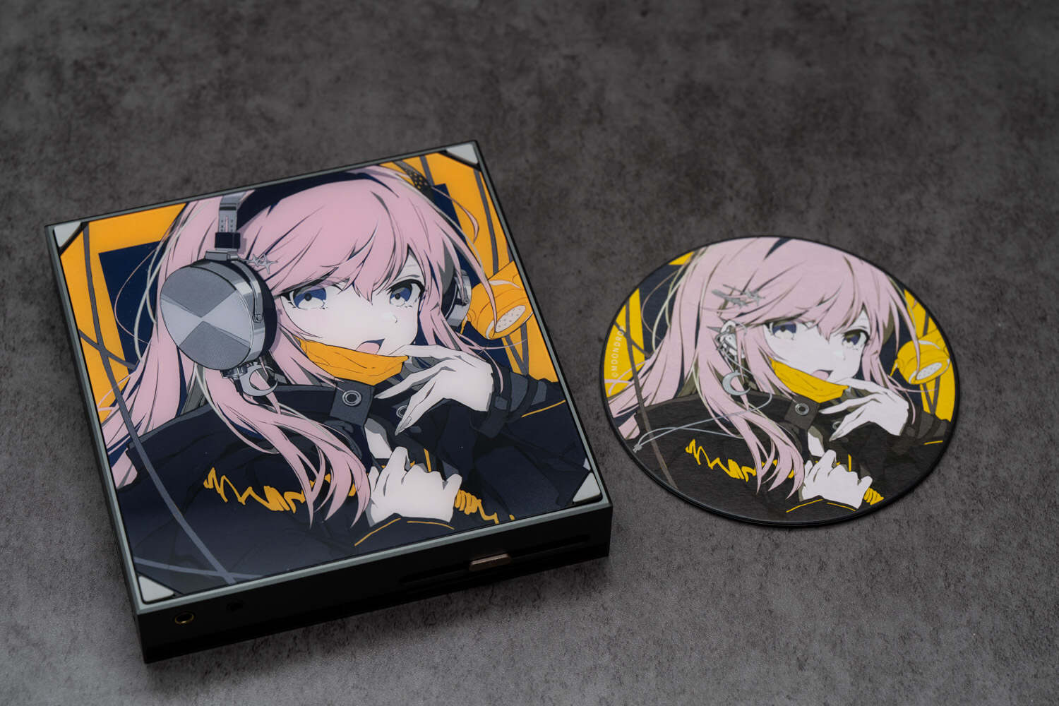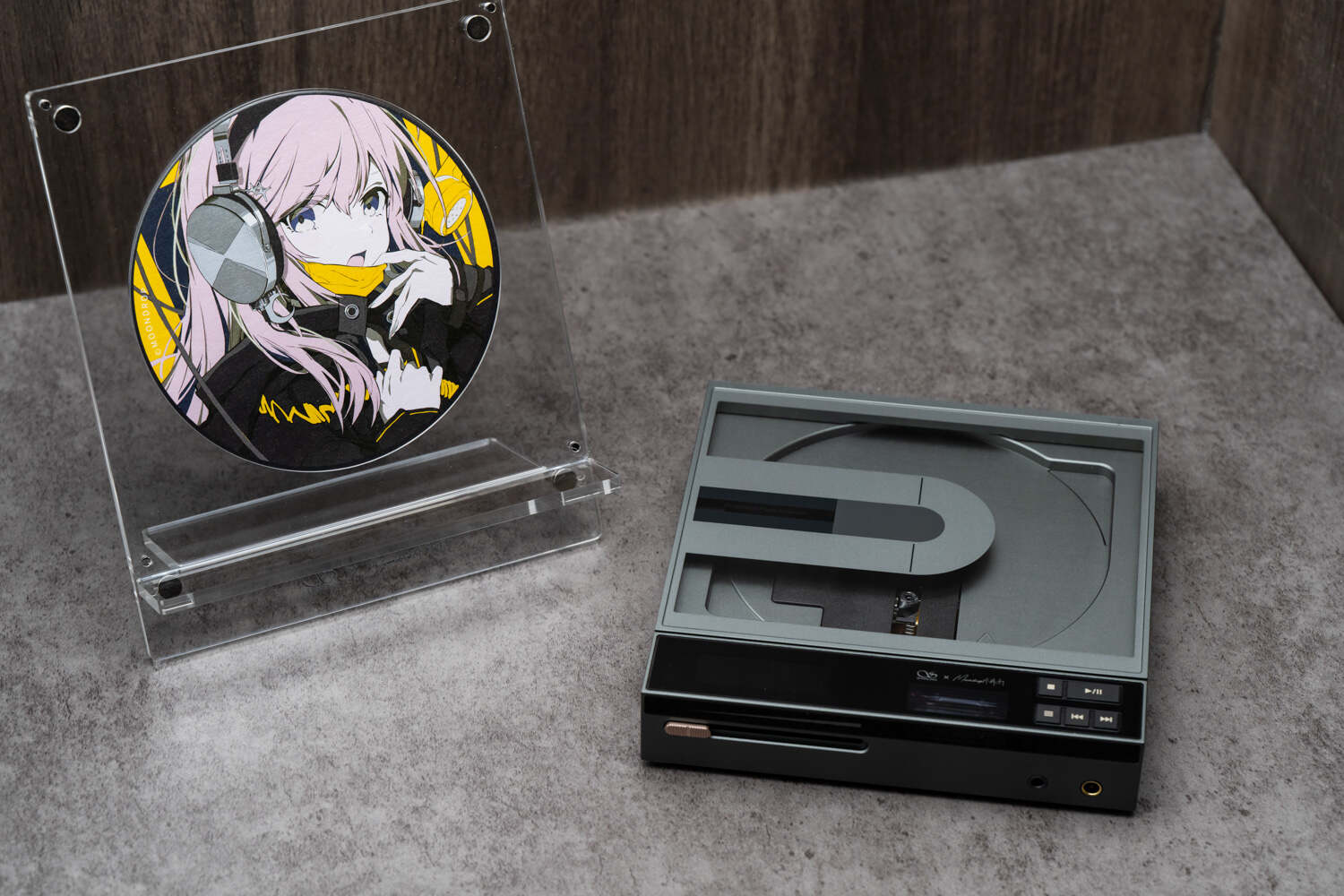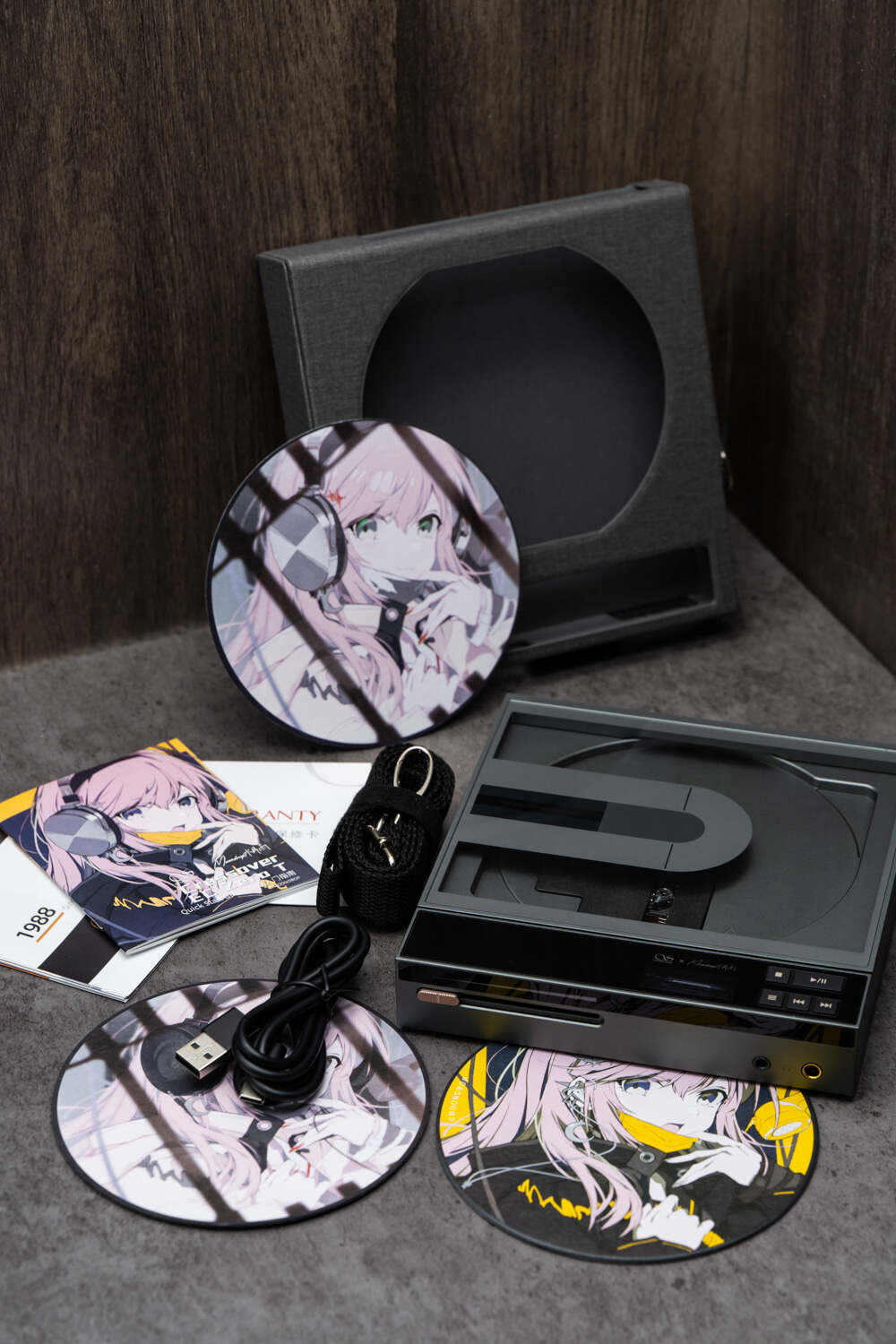 此外,附送的亚克力CD(机)支架是个很有意思的配件,组装过程中可以把标配的三张正反图案不同的仿真CD(其实是圆形纸板)放进去作为装饰,并且三张正反图案是同样的水月友希佩戴不同的水月雨耳机,很有趣味。组装好后,不论是用来展示你的CD碟收藏还是把Crossover本身放上去,都很协调和美观,实用性也不错。