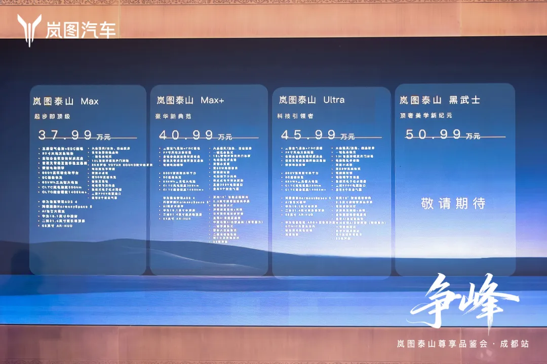 岚图泰山作为“9”系旗舰SUV,是岚图顶级整车技术与华为智能科技的集大成者,也是今年新能源豪华大六座SUV的压轴之作。2025年12月13日,争峰岚图泰山尊享品鉴会•成都站,在成都东安阁举办。岚图泰山也正式在成都区域上市,新车提供Max版、Max+版、Ultra版、黑武士版四大版型,官方指导价为37.99万元-50.99万元。此外,还推出了多项购车权益。