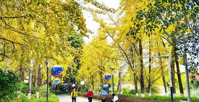 特别是灿烂阳光的日子,阳光透过高大苍翠的金黄色的银杏叶洒到林荫道的地面上,感觉真是很梦幻。