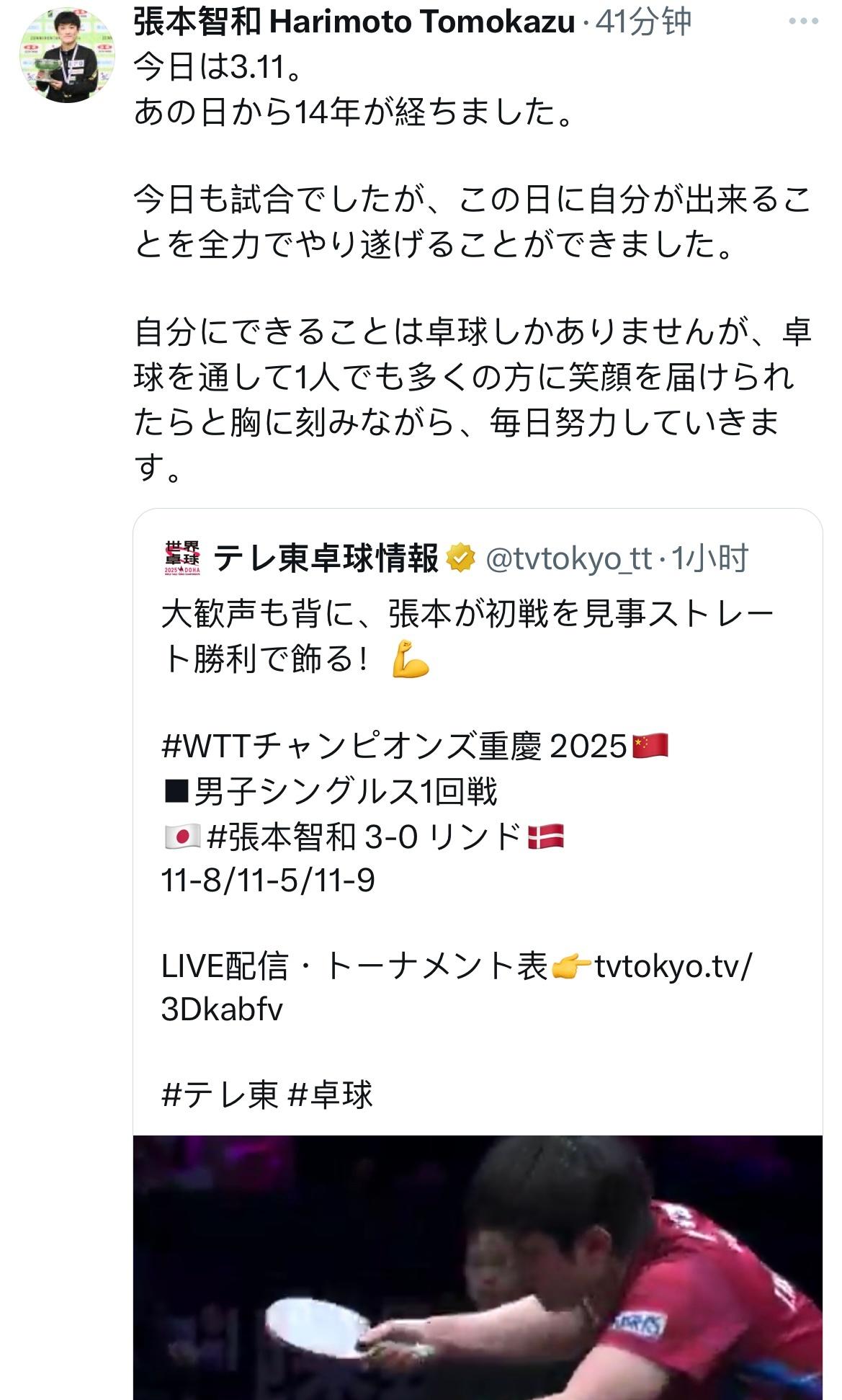 张本智和赛后的双手合十,是为了悼念2011年日本311地震的受难者。