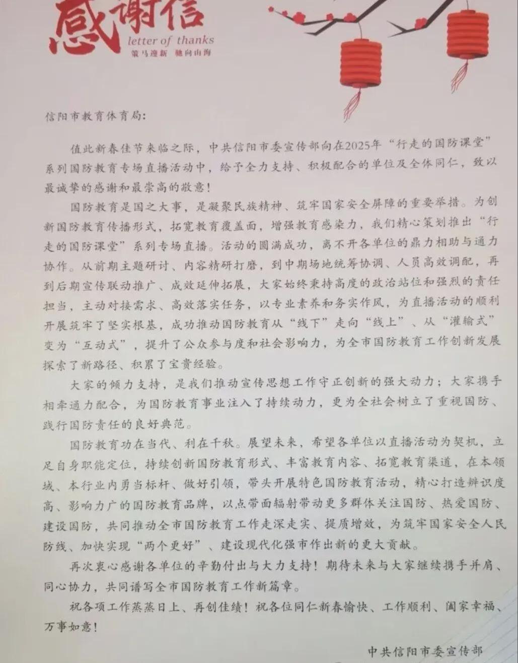 深化国防教育示范校创建,大力加强和改进学校国防教育工作,全市创建示范校22所,国防教育覆盖面不断扩大。统筹协调全市93所高中阶段学校的军训教官需求与训练计划,科学组织实施军事训练,圆满完成年度军训任务。积极配合市委宣传部开展“行走的国防课堂”系列国防教育专场直播活动,得到市委宣传部充分肯定,并对信阳市教体局发来感谢信。