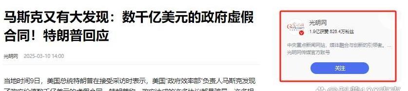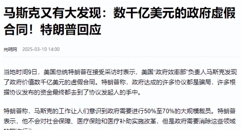 马斯克美国政府的“勾结”在马斯克的努力下,美国政府的贪腐问题正在被一步步揭开。据央视新闻报道,特朗普在接受采访时透露马斯克领导的“政府效率部”发现了政府价值数千亿美元的虚假合同,这个数字之大着实令人咋舌。但更令人不解的是这些虚假合同到底是怎么来的?这些钱又都去了哪里?特朗普直言不讳地表示:政府达成的许多协议都是骗局,很多按照协议发布的资金,最终都流入了协议发起人的口袋。听到这里我不禁感到一阵寒意,这背后到底是怎样一种利益勾结才能让如此巨额的资金被肆意挥霍?这其中又有多少见不得光的交易在暗中进行?