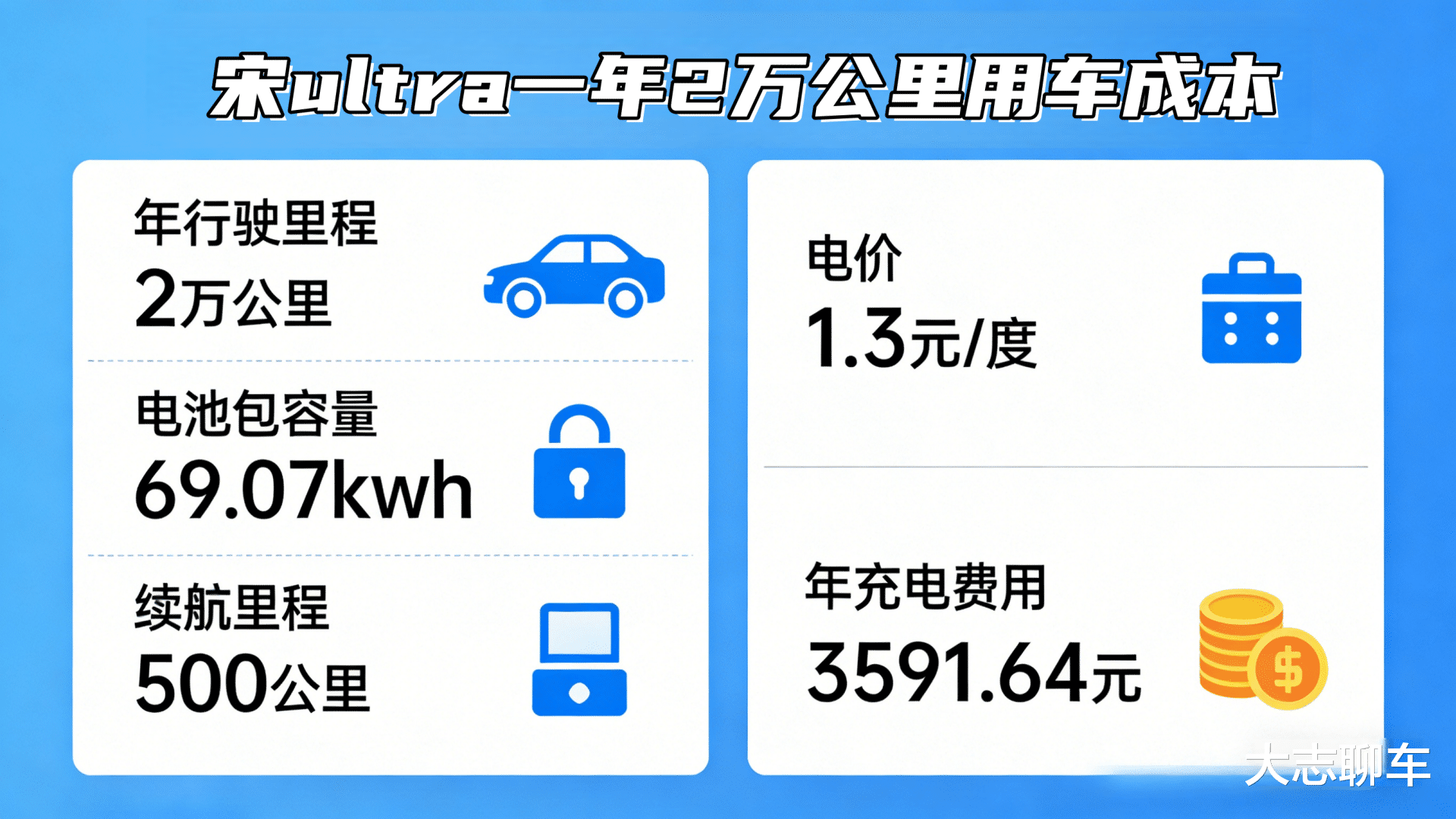 首先,我们要明白一件事情,就是车主一年会开多少里程?以一个正常的普通车主通勤来算,大概一年下来就是2万公里的里程,而这时候就以宋ultra EV来说,它的电池包是69.07kwh,而续航是605公里,一般这个续航是达不到的,需要打个折,正常开的话,也就是500公里左右,我们就按照这个来计算。