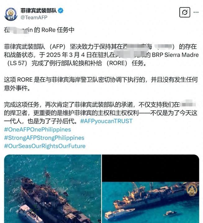 2025年3月5日,菲律宾武装部队发布了一则声明,宣布MV Lapu-Lapu号成功为非法“坐滩”在仁爱礁的“马德雷山”号登陆舰完成了新一轮的人员轮换和补给任务。菲律宾方面将此举描述为“主权的维护”,但事实上,这次补给行动是在中菲双方签订临时协议、得到中方允许并由中国海警全程监管下进行的。这场看似平静的补给行动,背后却隐藏着一场复杂的博弈。