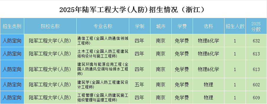 中国人民解放军陆军工程大学2025年人防系统定向招生在浙江招生5人。