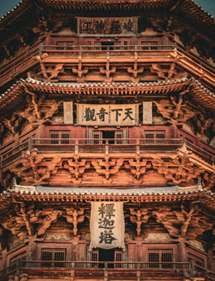上图为山西朔州市佛宫寺释迦木塔,第五层匾额“峻极神工”四字,为明成祖朱棣北征时所题;第四层匾额“天下奇观”四字,出自明武宗朱厚照之手。