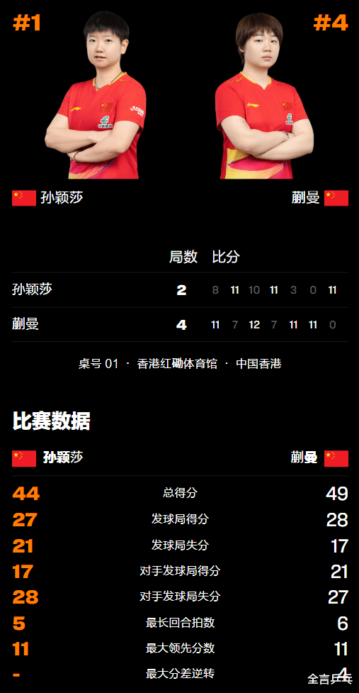 孙颖莎、蒯曼分别是目前世界排名第1和第4的运动员,目前均已在中国乒乓球队承担主力重任,此前也有过多次交手,孙颖莎虽然曾被对方突破,但优势非常明显。