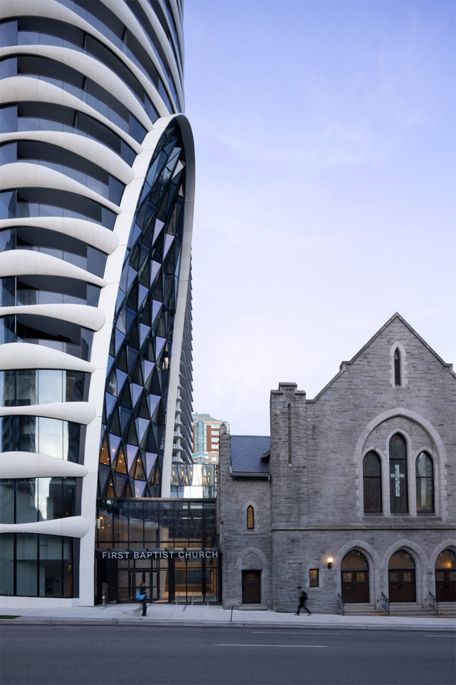 “蝴蝶”由知名建筑师谭秉荣(Bing Thom)设计,其事务所现已更名为Revery Architecture。建筑造型从邻近老教堂的管风琴中汲取灵感,立面采用绝缘玻璃纤维混凝土板,塑造出如“波浪云”般的流动形态。
