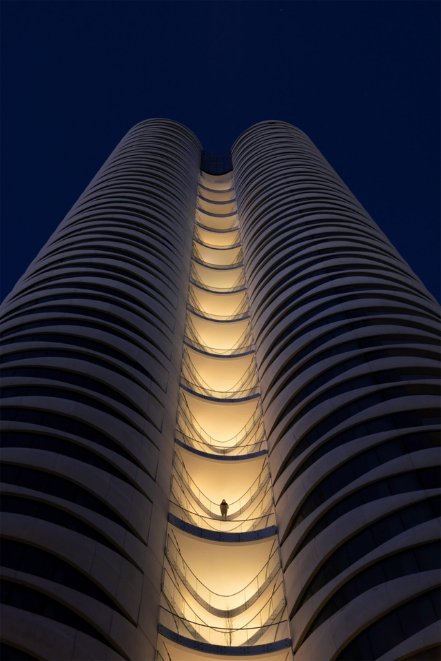 塔楼由多个圆柱形体量交错衔接而成,外观覆盖着玻璃与白色预制混凝土板。阳台环绕其间,柱体间的缝隙不仅塑造出建筑的韵律,也自然形成通风路径,让气流在立面间自由穿梭。