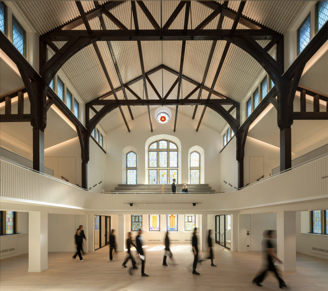 建筑的底部,一片倾斜的玻璃幕墙轻轻倚靠着相邻的教堂,尤其是那座历史悠久的管风琴结构。通过一层的通高玻璃连廊,教堂与塔楼大厅相连,内部设有举办音乐活动的空间。