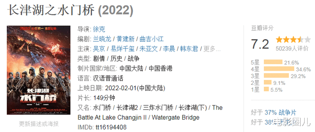 而在口碑方面,《水门桥》依旧给力,猫眼9.6分、淘票票9.6分,稳居春节档第一;豆瓣7.2分,也是上佳之作。