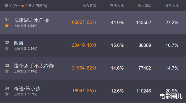 2月1号结束,《水门桥》27.2%的排片强势拿下了44%的票房占比,首日6.58亿的成绩也成为影史第二,仅次于热度无敌的《唐人街探案3》。同期的几部大片表现也可圈可点,但跟《水门桥》的票房爆发力还是没法比。