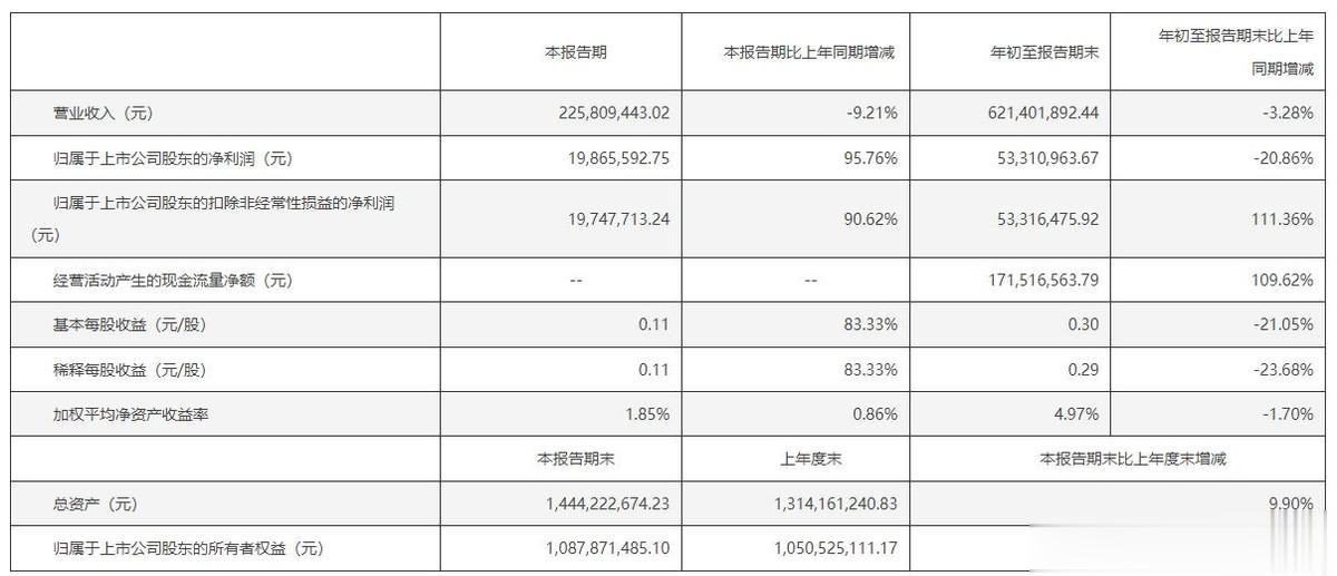 2025年前三季度公司实现营业收入621401892.44元,同比减少3.28%;实现归属于母公司所有者的净利润为53310963.67元,同比减少20.86%;实现归属于母公司所有者的扣除非经常性损益的净利润为53316475.92元,同比增加111.36%。