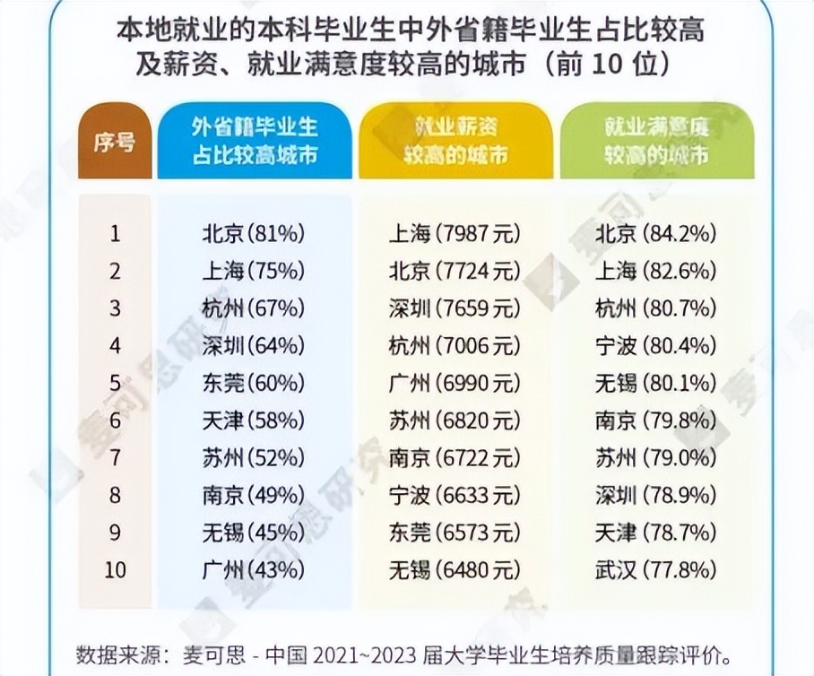 二线城市中,常州、佛山表现抢眼,在两地就业的本科生外省籍占比分别为35%、34%;2023届本科毕业生毕业后半年后平均月收入分别为6072元、6275元;就业满意度分别为76.1%、76.5%。