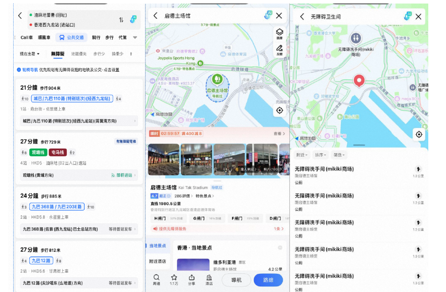 针对香港出行场景的特殊性,高德无障碍导航进行了精准适配与资源整合。目前已上线1000余条无障碍巴士线路,收录数千个无障碍设施点位,涵盖无障碍直梯、无障碍洗手间、无障碍通道等核心公共设施,同时覆盖90余个重要场所,包括赛事场馆、交通场站、酒店及购物中心等,用户通过高德APP搜索,即可一键查询这些场所的无障碍出入口、设施分布等关键信息。在导航体验上,用户开启“无障碍模式”后,系统将自动优先推荐配备无障碍直梯、升降机的地铁及有无障碍设施的公交路线。