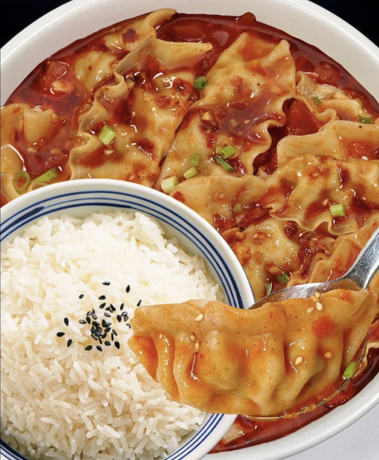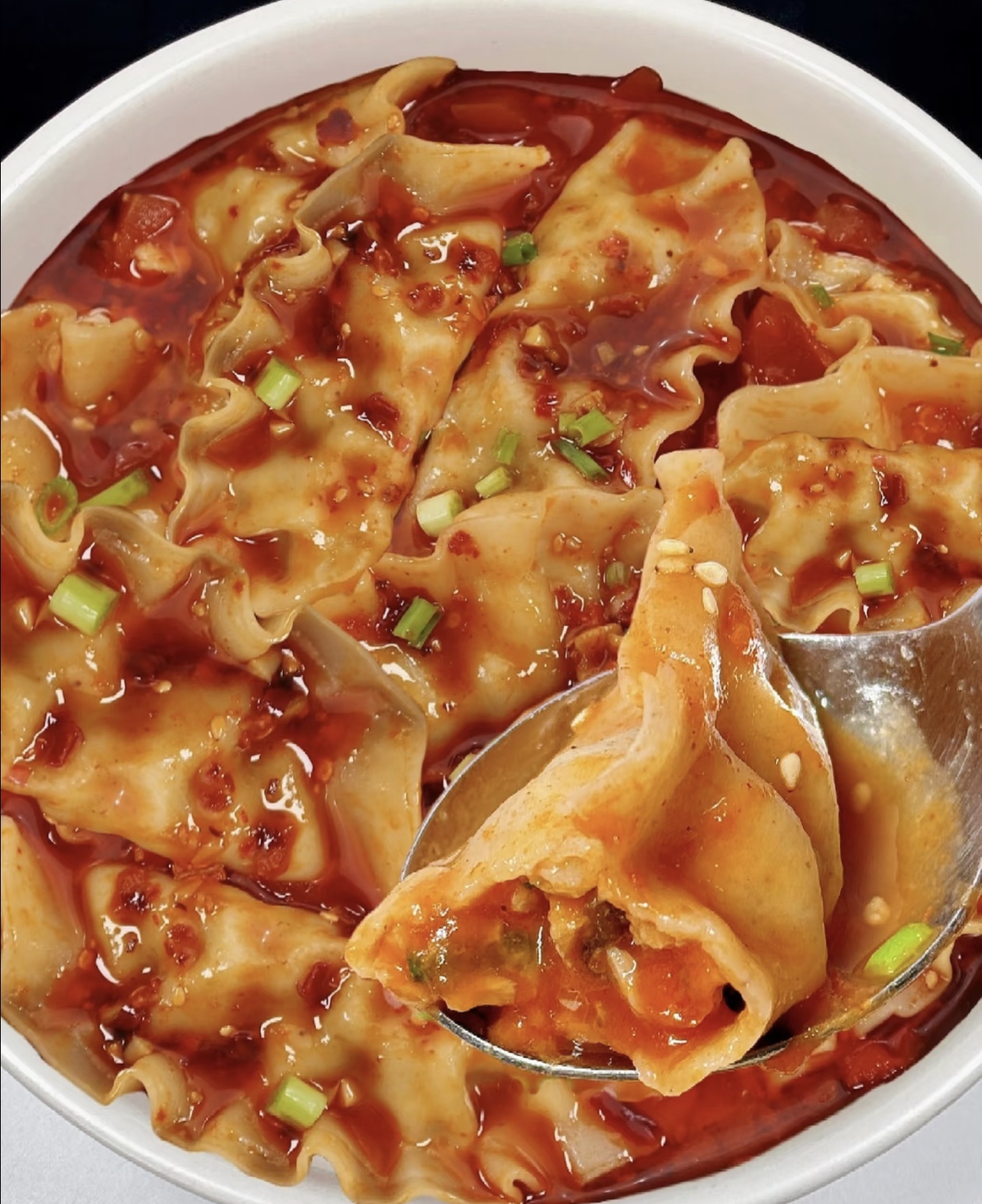 饺子煮好后,连汤带水一起盛到调好酱汁的大碗里,用勺子轻轻搅拌,让每一个饺子都均匀裹上浓郁的汤汁和酱汁。这时你会看到,红亮的汤汁包裹着饱满的饺子,上面漂浮着星星点点的芝麻和辣椒碎,光是看着就让人食欲大开。