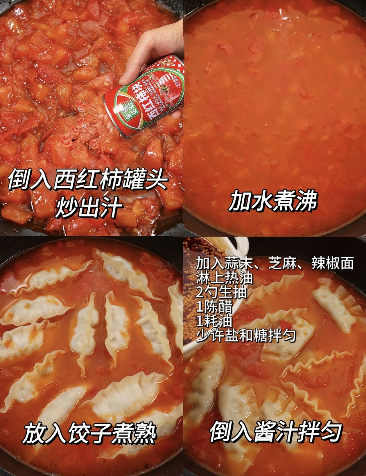 准备工作其实很简单,不需要复杂的食材。主角就是我们的西红柿罐头和速冻水饺,西红柿罐头比新鲜番茄更容易出沙,熬出来的汤底更浓郁。再准备一些蒜末、白芝麻、辣椒面,还有生抽、陈醋、蚝油、盐、糖这些基础调料就够了。