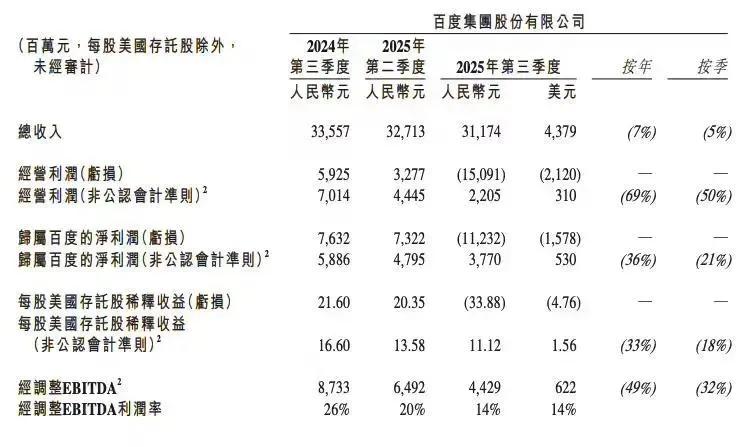 百度2025年Q3财报显示,总营收312亿元人民币,同比下降7%;核心营收247亿元人民币,同比减少7%。AI业务收入首次单独披露,达到96亿元,同比增长超过50%。归属于百度的净亏损为112亿元,而上年同期净利润为76亿元。