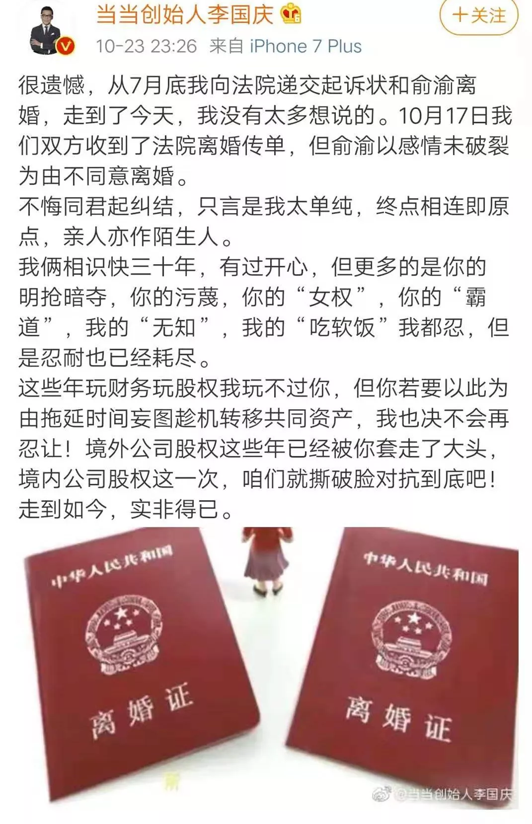 翻看俞渝女士的控诉,她说李国庆绑架了自己二十年,自己已经受够了这一切。