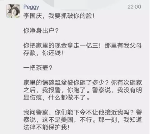 李国庆曾暴力砸家,把整桌饭菜掀翻到俞渝身上。俞渝吓到报警,不过警方觉得俞渝身上并无伤痕,无法立案。