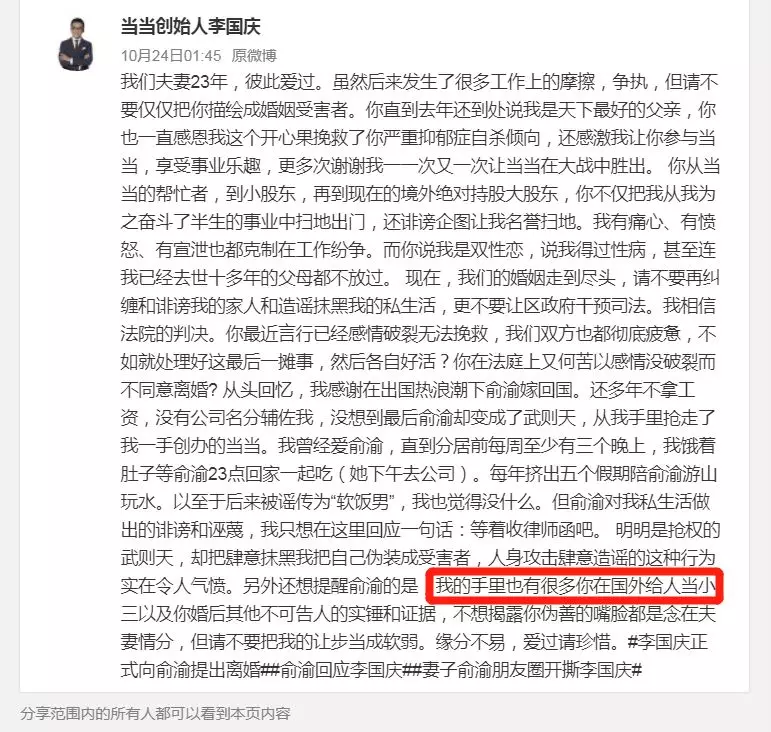 俞渝发表评论后,李国庆也在微博上发布了回应。