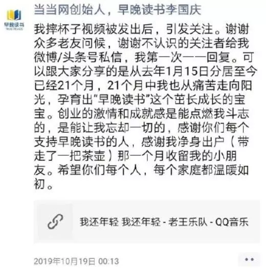 10月19日,李国庆在朋友圈转发了老王乐队的《我还年轻 我还年轻》,说自己离开当当网后又创业了,感谢净身出户时某位收留了自己一个月的小朋友。