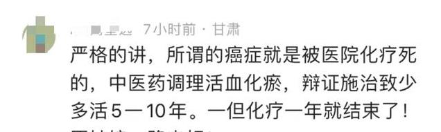 也有网友提出癌症治疗应该选择中医治疗,中医治疗至少能多活5到10年,如果用西医化疗,差不多一年就结束了。
