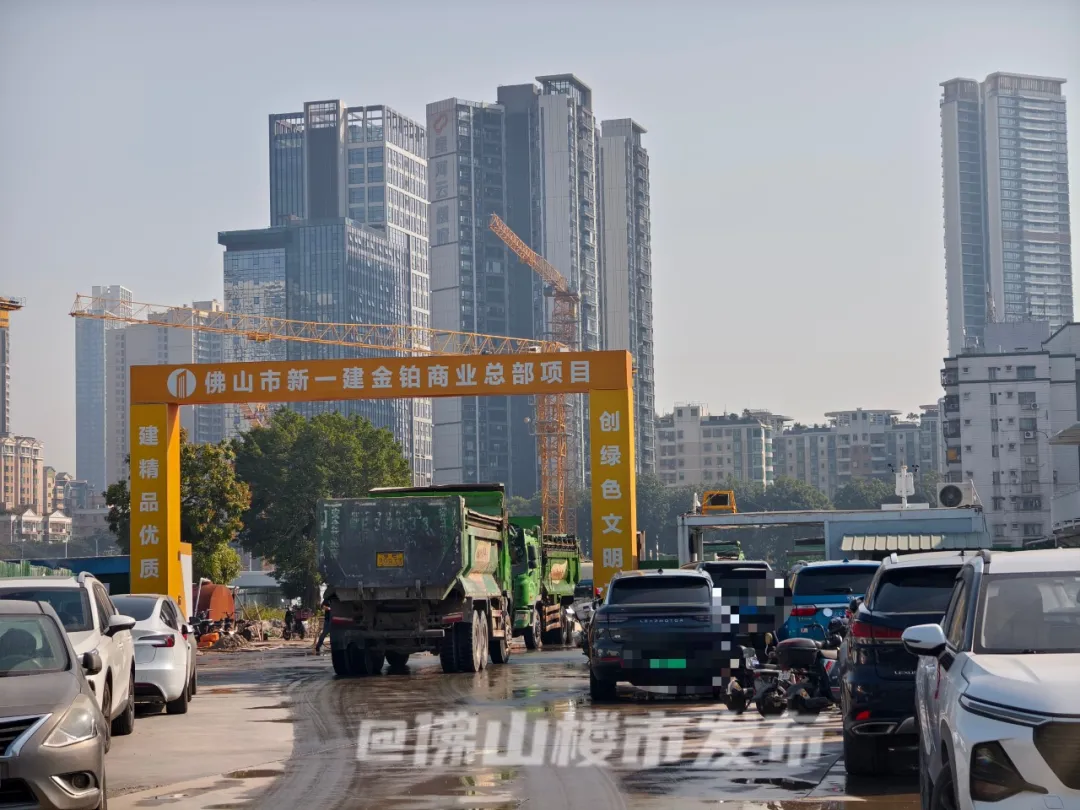 | 朝东1号地块航拍图|佛山楼市发布摄工地大门口,运输货车往来穿梭,内部机械轰鸣,一派火热建设景象。