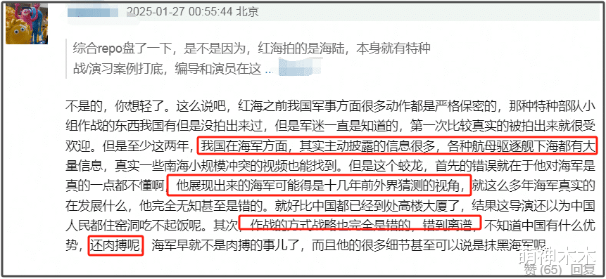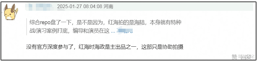 有网友根据各种电影评价猜测是不是《红海行动》拍摄的题材有特种部队演习案例打底,战斗逻辑正确,但《蛟龙行动》海战没有案例参考,所以逻辑错误。懂军事的网友直接反驳称我国海军主动披露了海量信息,《蛟龙行动》表现的是完全不懂海军,展示出来的视角是十几年前外界的认知,与现实有巨大割裂,特别离谱。