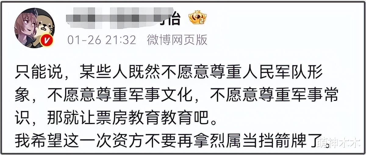 他们旗下的工作人员也发文吐槽称是纯烂片,还直接表示某些人不尊重人民军队形象及军事文化常识,那么就让票房来教育,并喊话资方别再拿烈属挡箭牌。