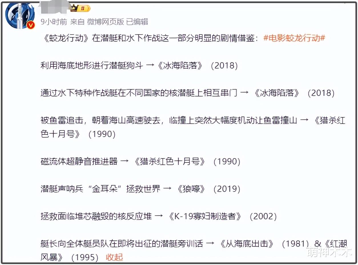 而且,他还发文称《蛟龙行动》表现精彩的水下作战部分有明显的剧情借鉴,累计起来有7部影片,比如鱼雷追击、潜艇狗斗等画面。