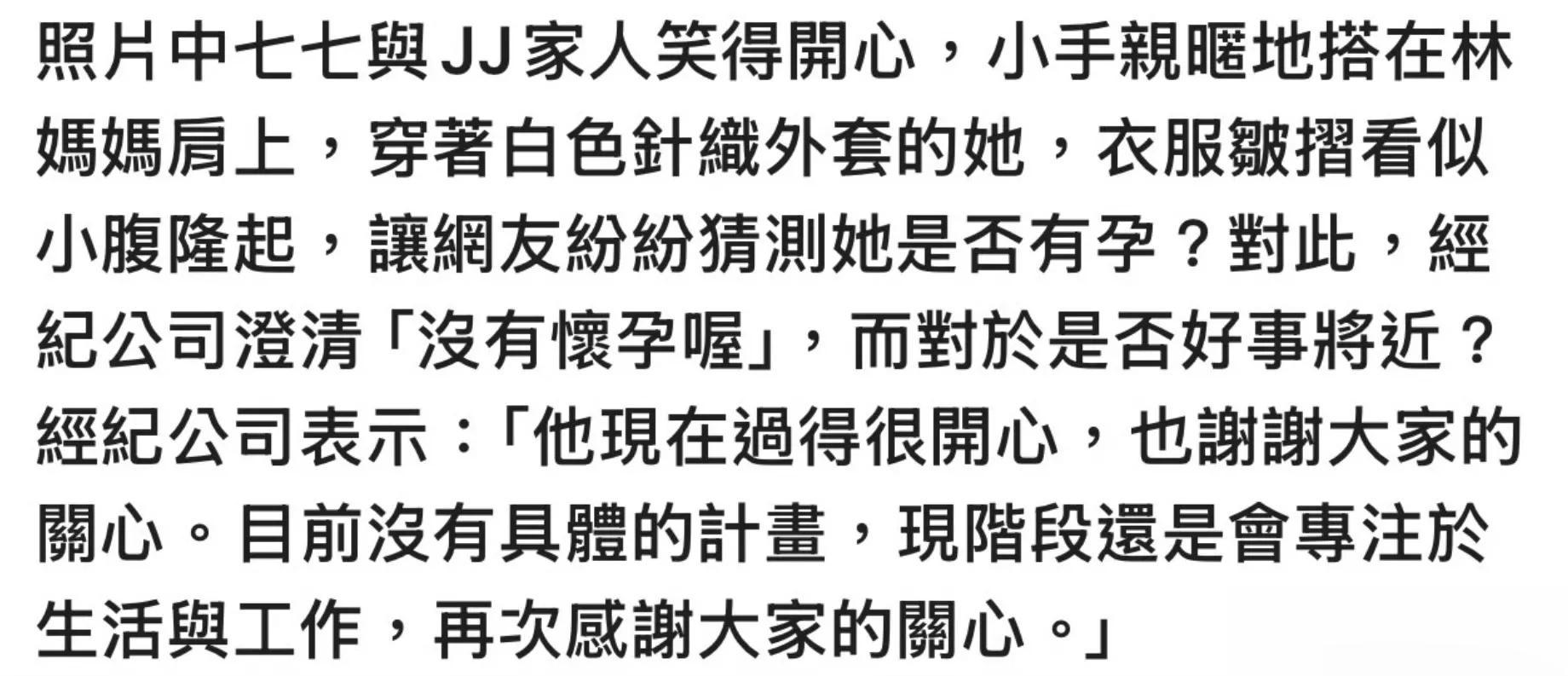 粉丝和网友们纷纷送上祝福的同时,也将目光聚焦到了他的女友七七身上。很快,一张合照引发了新的猜测——有网友敏锐地察觉到七七似乎有孕相,一时间,“林俊杰女友怀孕”的传闻甚嚣尘上,在网络上疯狂传播。