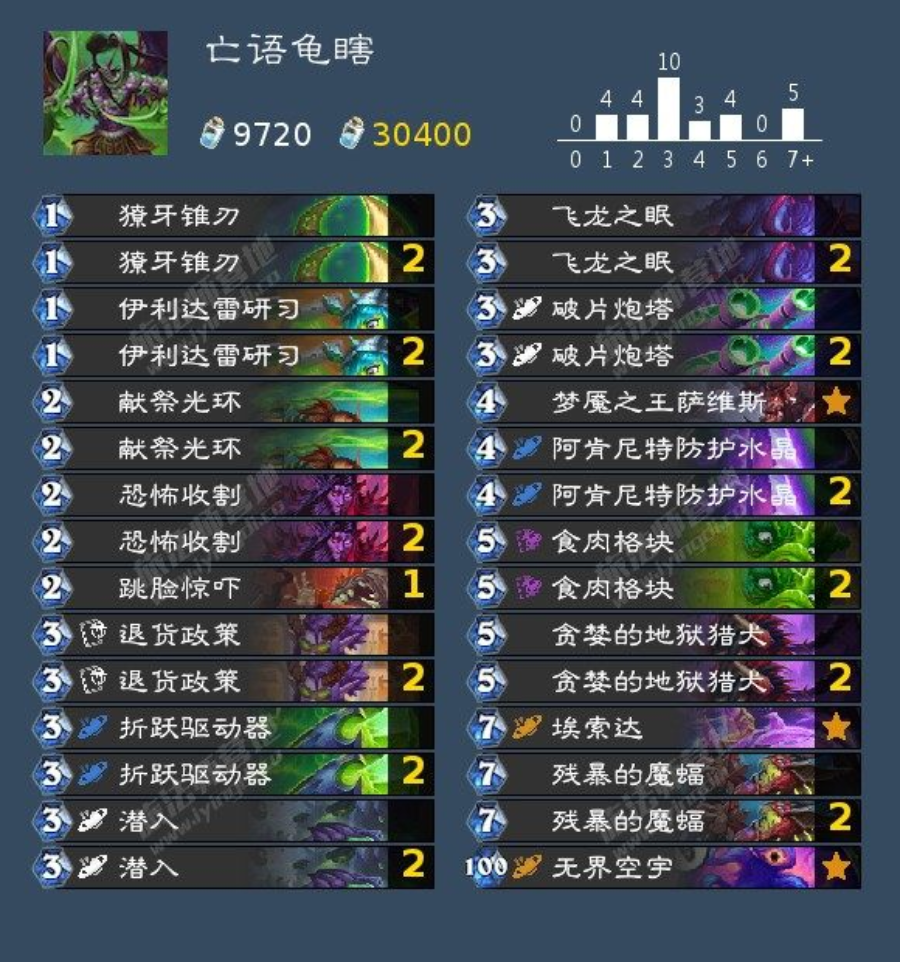 龟瞎能够玩得起来也有赖于目前环境比较慢,没啥特别厉害的快攻,龟瞎前中期空窗期还是很明显的,尤其是下地狱猎犬和魔蝠的时候,这俩随从本身没有嘲讽,很容易被无视然后直接踢脸,所以食肉格块千万别贪去吃775魔蝠,直接吃553地狱猎犬就行了,前期龟瞎的魔种体系也能让他苟到防护水晶铺满场的时间点。当然龟瞎也有可能输于防护水晶不上手,不过恶魔猎手有定向抽亡语的獠牙锥刃,以及超强的过牌能力,除非特别非一般也不至于完全摸不到。但说实话龟瞎内战是真的折磨啊,基本上很难靠常规的斩杀方法结束比赛,清风个人比较喜欢带一张跳脸惊吓,既可以找猎犬魔蝠增加水晶数量,还能找基尔加丹开传送门,当然也可以选择直接带上一张基尔加丹。