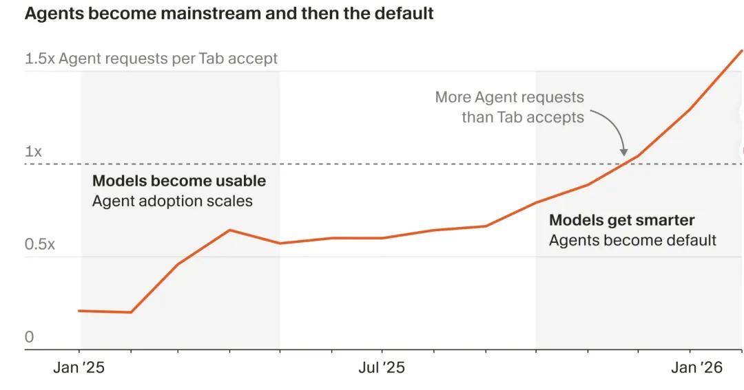 数据显示,2025 年 3 月,Cursor 的 Tab 用户数量大约是 Agent 用户的 2.5 倍,而现在,这一比例已经反转 ——Agent 用户数量是 Tab 用户的 2 倍,且 Agent 使用量仍在快速攀升。