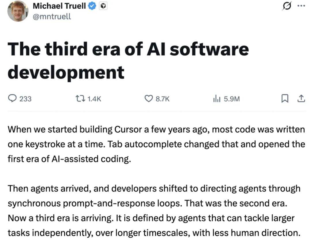 近日,Cursor CEO Michael Truell 在 X 上发文称,当下已正式迈入 AI 编程的「第三时代」,而这个新时代的典型特征是,Agent 能在更长的时间跨度内、更少人工干预下,独立完成更大规模的任务。
