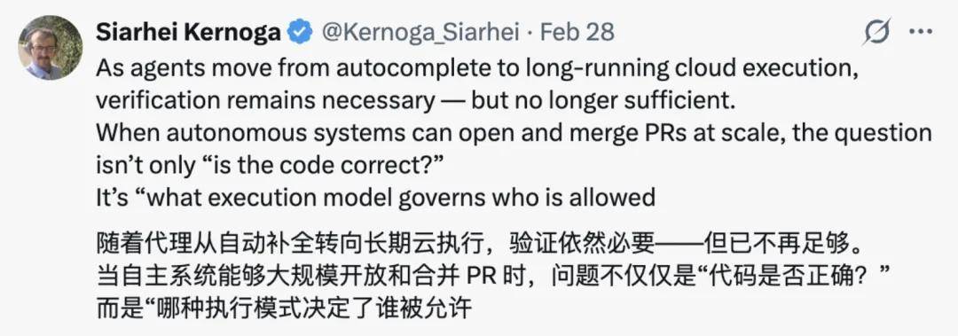 网友 Siarhei Kernoga 则认为,随着 Agent 从自动补全迈向长时运行的云端执行,验证仍然是必要的 —— 但已不再充分。当自主系统能够规模化地打开并合并代码提交时,问题已不只是「代码是否正确」?而是「究竟由什么样的执行模型来决定 —— 谁被允许合并,以及在什么条件下可以合并」。
