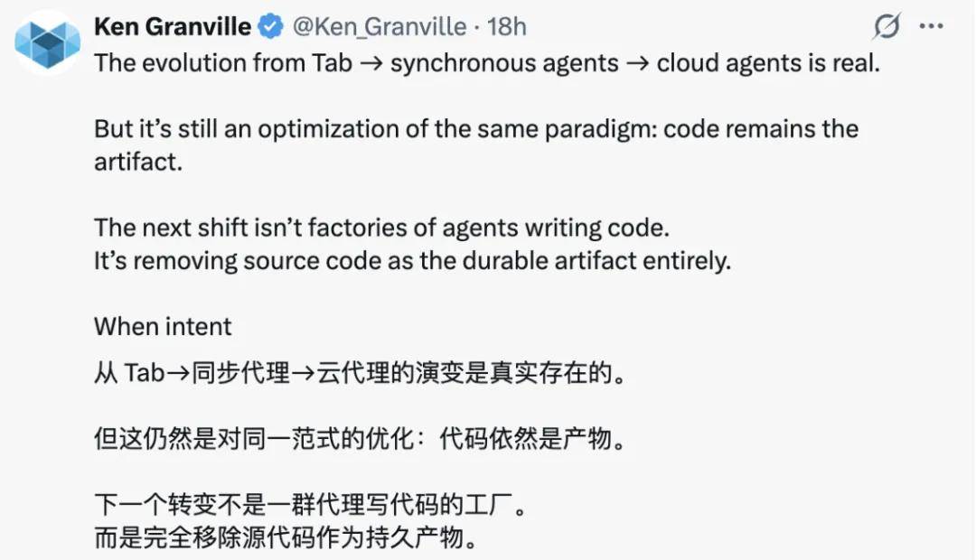 针对 Michael Truell 的分享,网友 Ken Granville 认为,从 Tab 到同步 Agent 再到云端 Agent 的演进,确实是正在发生的,但这仍然是在同一范式下的优化:代码依然是最终产物。下一次真正的跃迁,不是让一群 Agent 工厂化地写代码,而是彻底移除「源代码」这一持久化产物本身。「当『意图』可以直接被执行时,整个技术栈都会随之改变。」