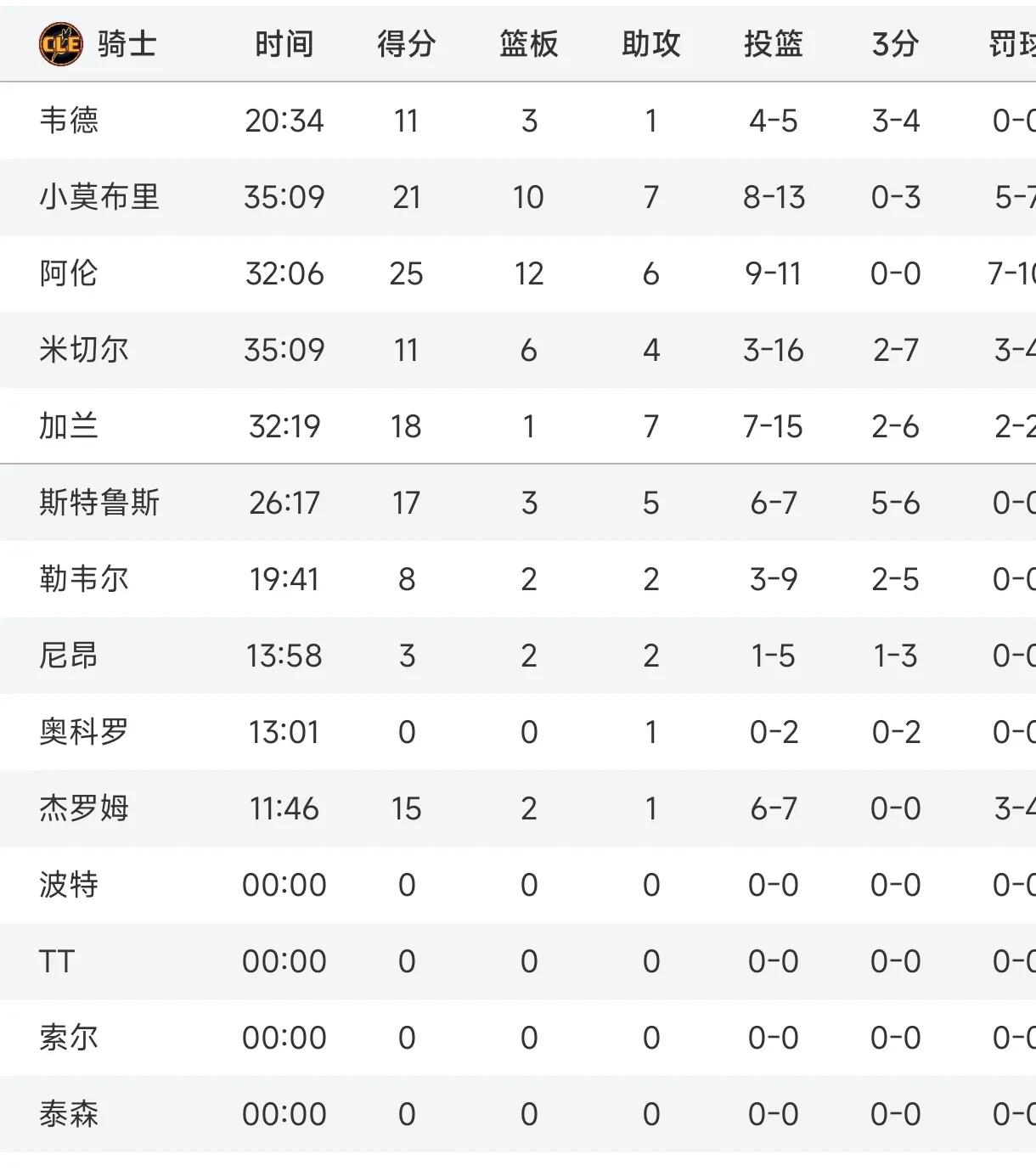骑士方面,阿伦拿到最高的25分,全队6名球员得分上双。