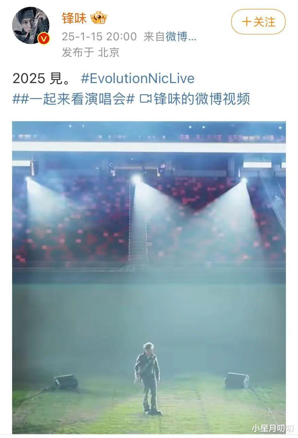 1月15日晚,谢霆锋通过个人社交媒体账号发布了一段视频,宣布将于2025年举办名为“EvolutionNicLive”的演唱会,并在视频中留言:“2025年,我们不见不散。”