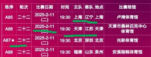 中国排协公布2月11号赛程如下,周二晚上七点半有四场比赛同时开打,央视直播北京女排对阵深圳女排。