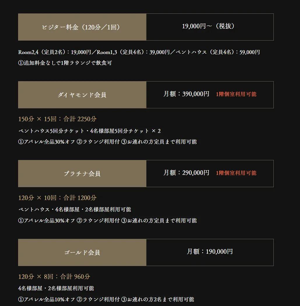 对于频繁光顾的客人,店家还提供会员制方案。最高等级的会员月费约39 万日元,且名额有限——只有会员,才能优先、甚至限定性地预约高级包厢。