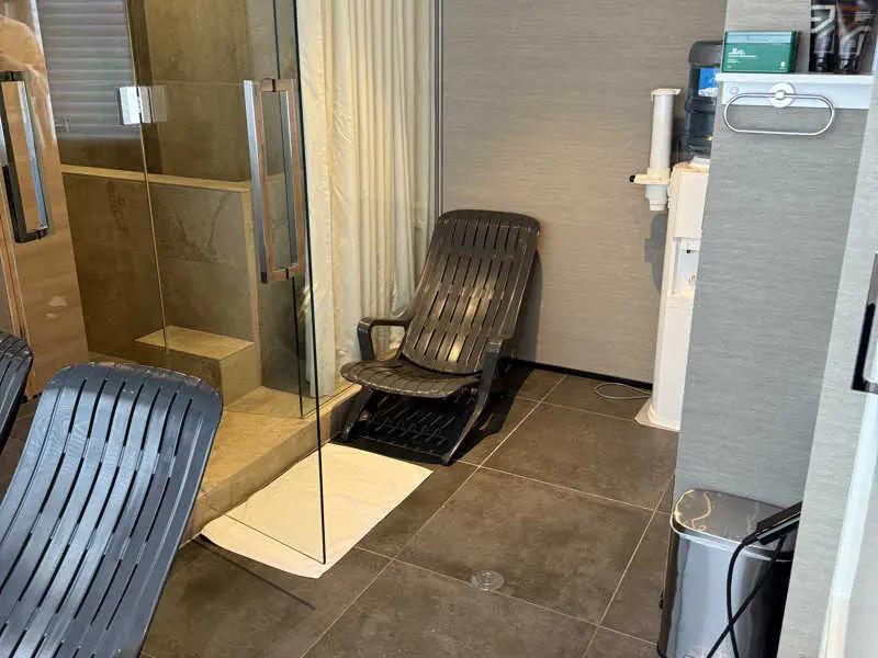 “整体外观以黑色为主,风格沉稳,室内装潢强调奢华质感,很符合‘高级包厢桑拿’的定位。桑拿帽、浴袍等备品也一应俱全。