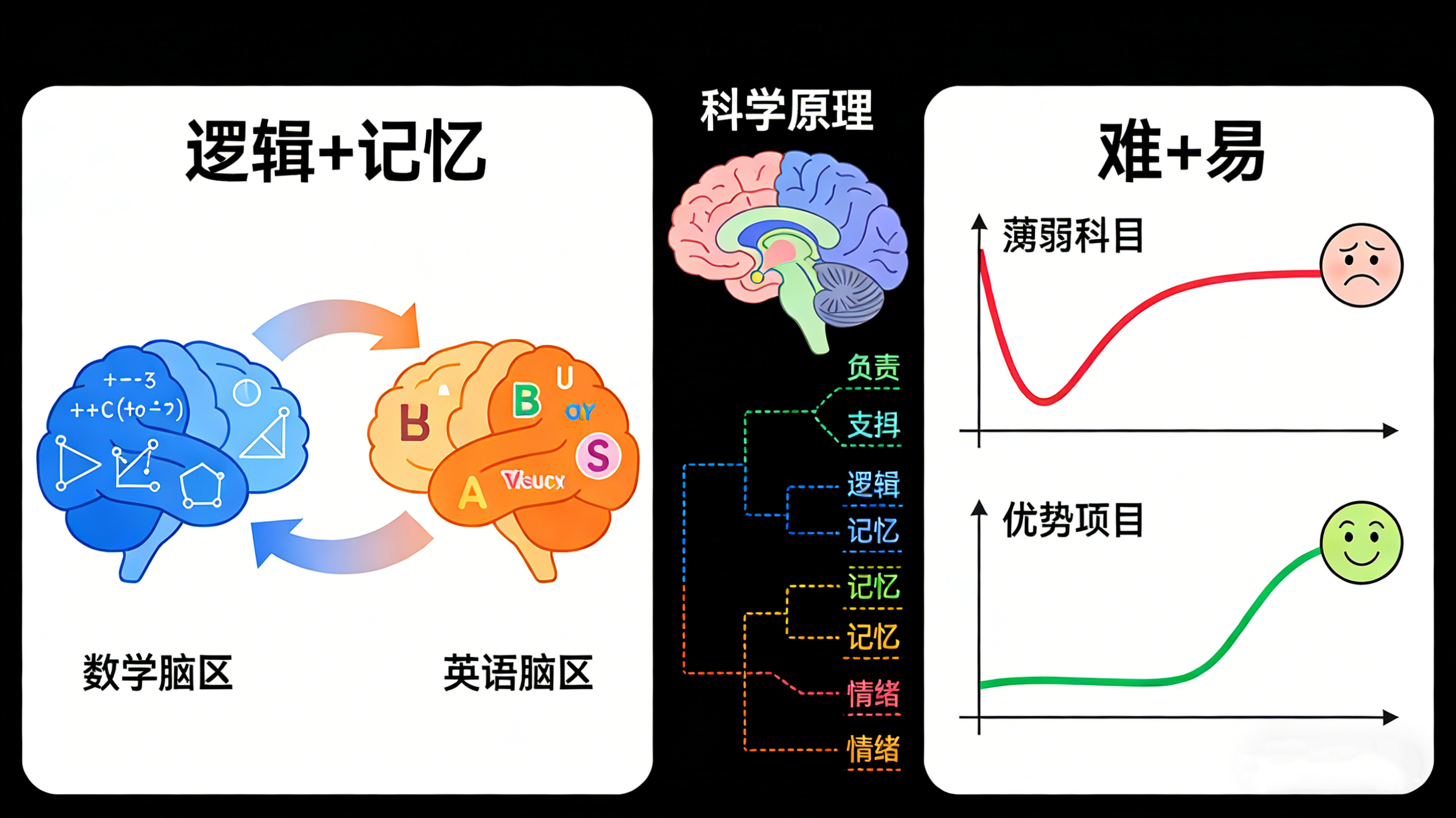 科学原理:不同学科用到的大脑区域不同,比如数学用到逻辑推理区,语文用到语言记忆区,交替学习能让疲劳的脑区休息,活跃的脑区继续工作,就像工厂换班一样,保持整体效率在线。