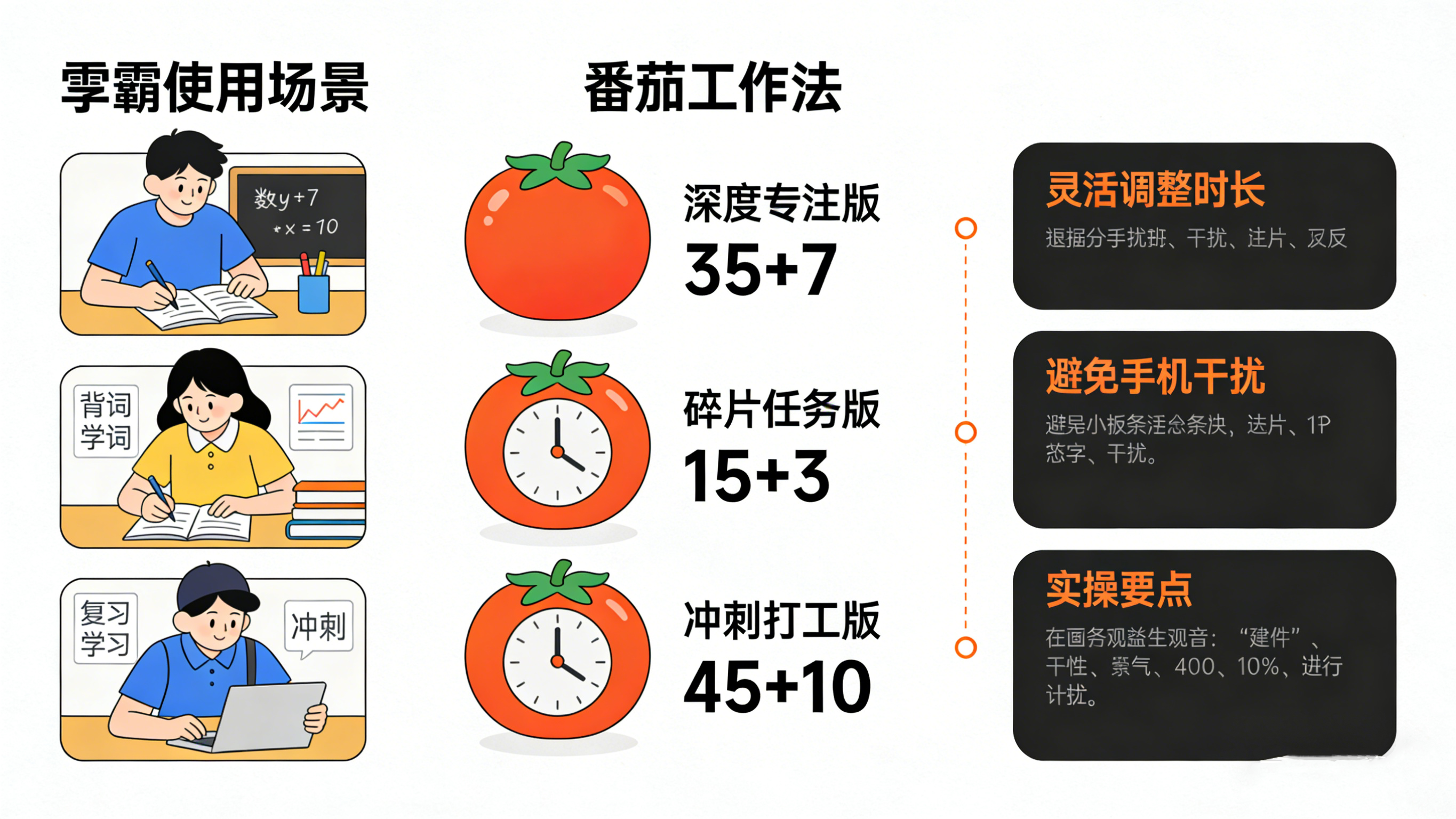 1. 番茄工作法:不止25+5,3种变体适配不同学习任务一提到番茄工作法,很多人就想到“25分钟学习+5分钟休息”的固定公式。但实际学习中,有的任务需要深度专注,有的任务零散琐碎,死板套用只会适得其反。学霸们的做法是:根据任务难度调整时长,让番茄钟真正服务于效率。