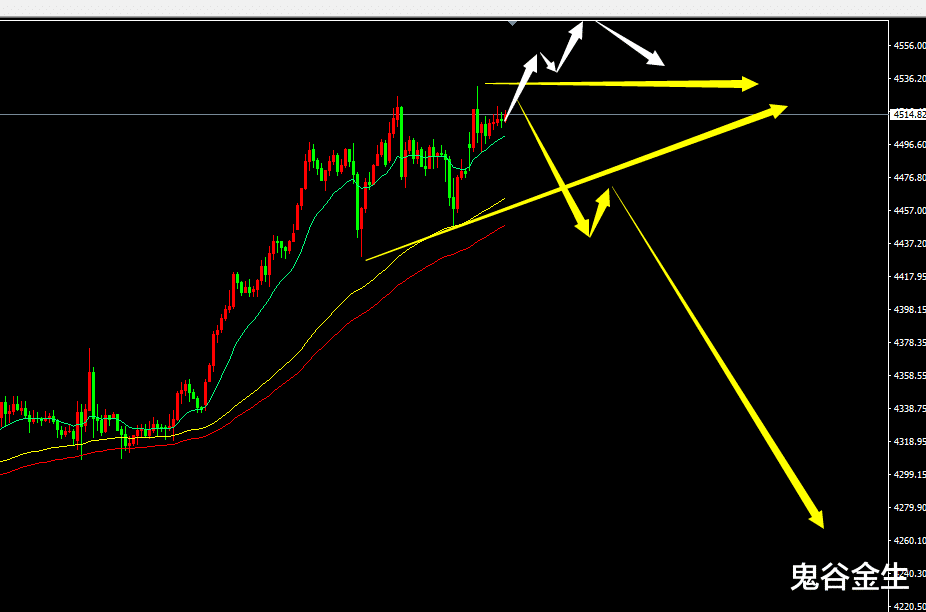 分析行情之前我们首先谈下当下金银市场,近期鬼谷见到了太多白银黄金空头爆仓的账户,为什么,都是逆势做空不止损的,说到底还是人性,涨高了就想去空,想抄顶,想去做第一人,结果。。。那么当下我们该怎么办,首先4500这里鬼谷是不建议继续追多的,哪怕后面会到5000,内盘1500,但那是以后的事情,因为散户根本拿不住,一旦中间出现大幅度回撤,都会被清理出场,所以我们眼下要做的就是不抄顶,不逆势扛单,做好日内,最后保持一个静待顶点到来的心就行了,至于什么时候来,不要去猜测,等就行,假如4531是顶部,你现在就可以空,做好止损就行,一旦成功就是i顶部,顶部不是靠猜出来的,是靠做,有些人就是不止损,导致从4000一路猜顶到4500;