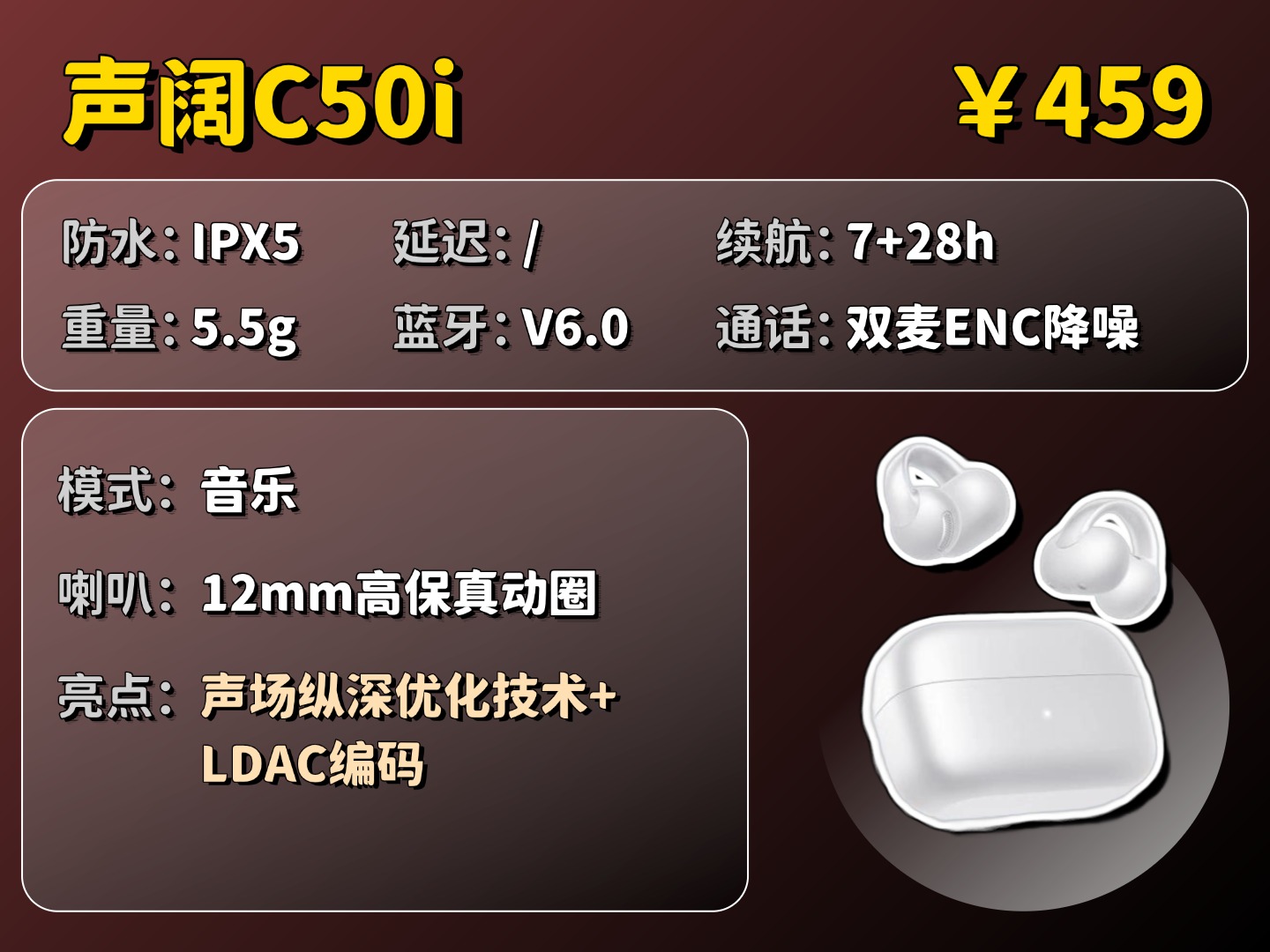 声阔 C50i 在音质上搭载了12mm高保真动圈单元,搭配声场纵深优化技术后,能让声音的立体感和氛围感更足,听音的空间层次也更开阔,声音细节能听得更清晰;同时还支持LDAC高清编码,能留住丰富的音乐细节,整体听感饱满,还很有层次感。